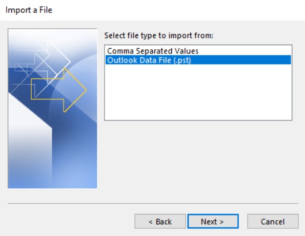 - Choose the Outlook Data File (.pst) option and click Next.