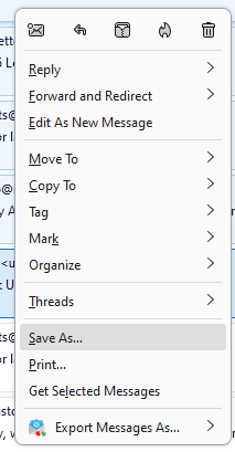 - While in Thunderbird, select the email/s you want to export to Outlook. Right-click on them and click on Save As.