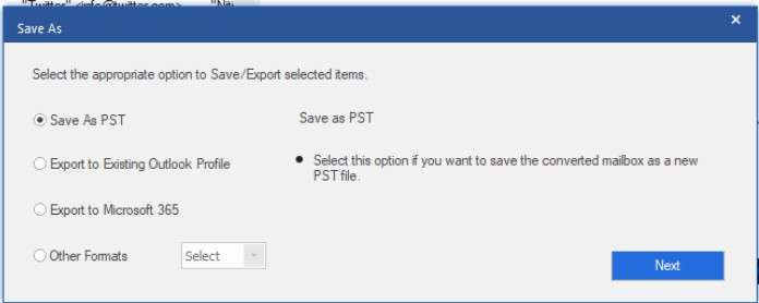- In the Save As window, select the Save as PST option and click Next.
